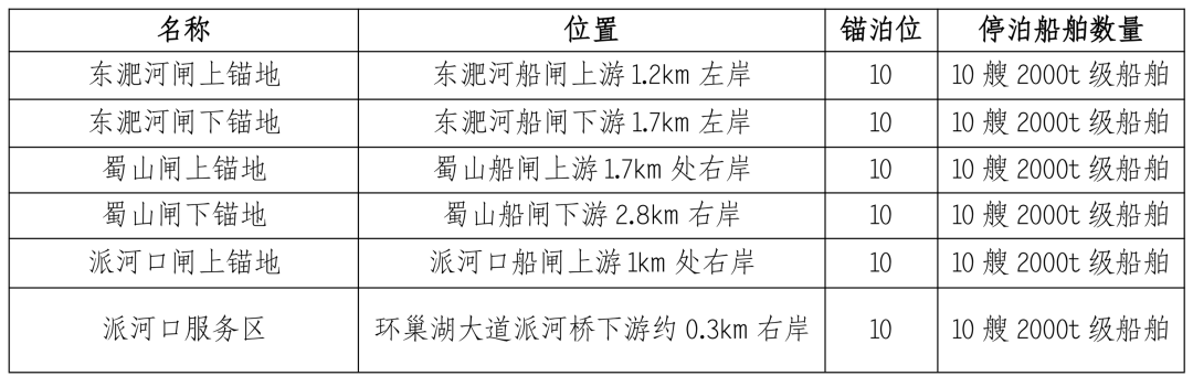 工程沿線建有5個錨地,分別為東淝河閘上、閘下錨地,蜀山閘上、閘下錨地,派河閘上錨地。